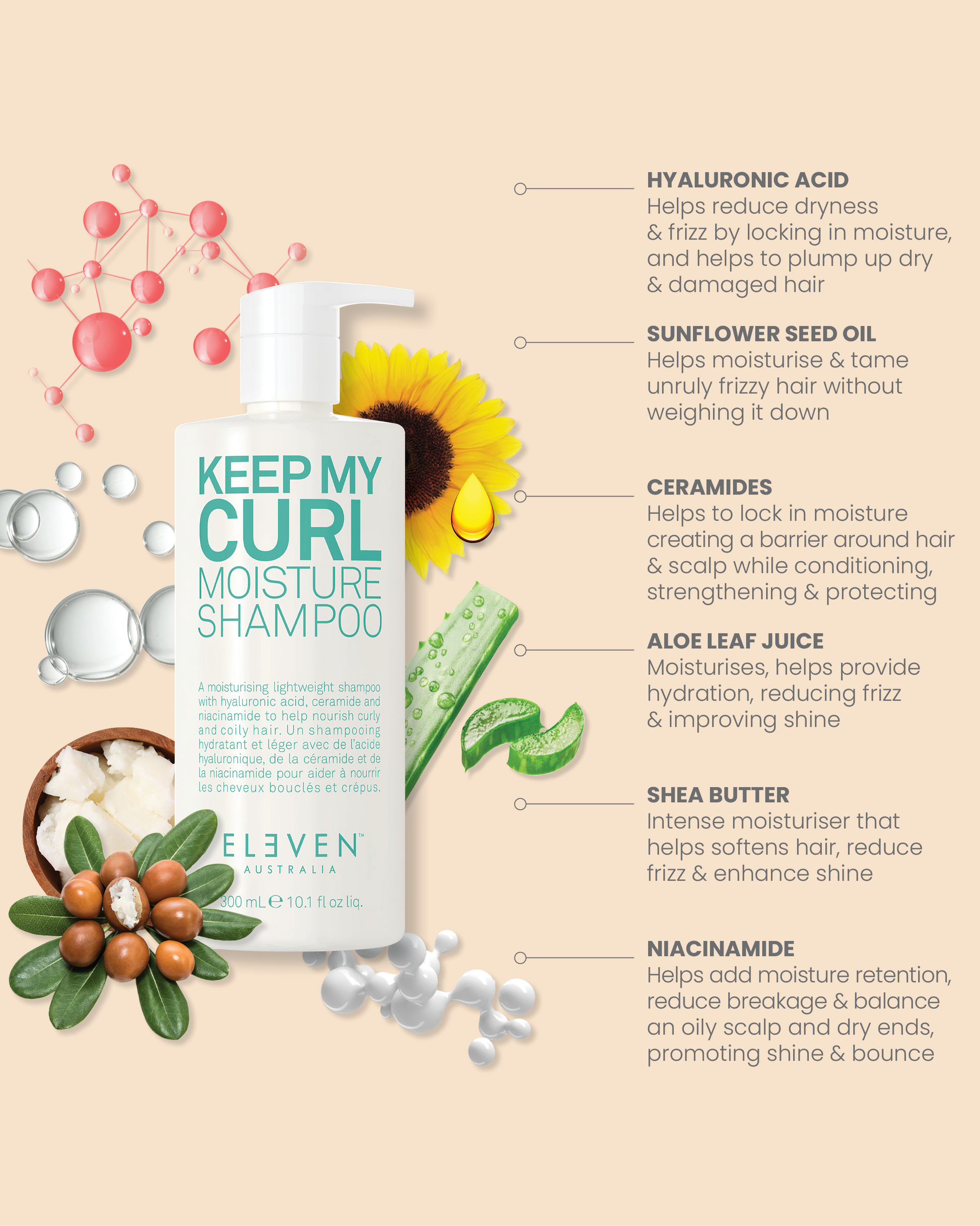 Enter & embrace your curl era with ELEVEN Australia’s NEW Keep My Curl Moisture Shampoo & Conditioner – a new haircare duo that merges the best of skincare science with curl care essentials! With ingredients like Hyaluronic Acid, Ceramides, and Niacinamide – staples in skincare – this line marks a modern approach to curly hair care that’s all about nurturing from scalp to ends. The result? Soft, weightless, bouncy, and defined curls that look as healthy as they feel.